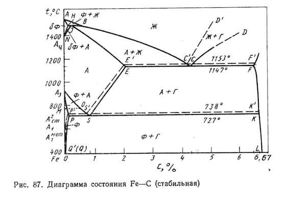 Диаграмма состояния стабильного равновесия показана на рис.87 (штриховые линии соответствуют выделению графита, а сплошные – выделению цементита).