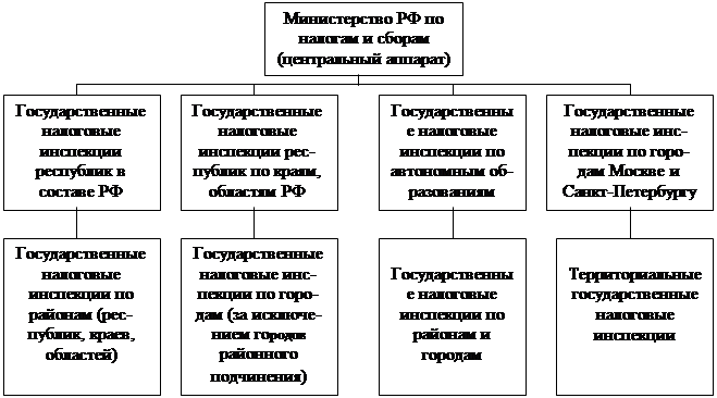 На Министерство РФ по налогам и сборам возложены выработка и осуществление единой налоговой политики с целью обеспечения своевременного поступления в бюджеты всех уровней и государственных внебюджетных фондов налогов и других обязательных платежей в полном объеме. Систему органов Министерства РФ по налогам и сборам можно изобразить следующим образом: