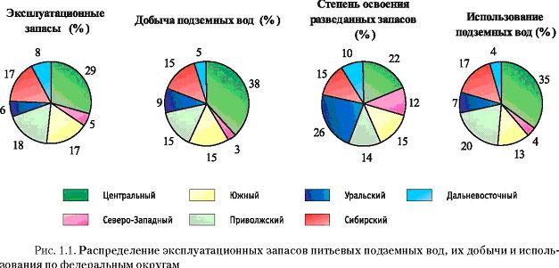 /сут или 31 % от общей величины по Российской Федерации, от 14 до 18 % приходится на долю трех округов: Сибирского - 5,37 (17 %), Приволжского - 5,68 (18 %) и Южного - 4,39 (14 %). По остальным трем округам суммарная величина добычи и извлечения подземных вод составляет 6,02 м3