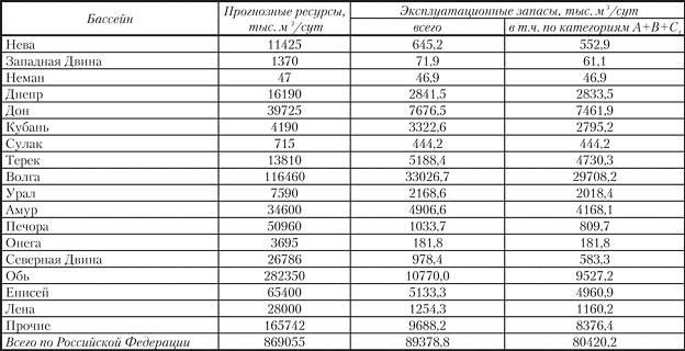 /сут: Волги - 33,03, Оби - 10,77, Дона - 7,68, Енисея - 5,13, Амура - 4,91 и Кубани - 3,32 (табл. 1.6). Суммарная величина разведанных эксплуатационных запасов по 7 этим речным бассейнам составляет 64,84 млн. м3