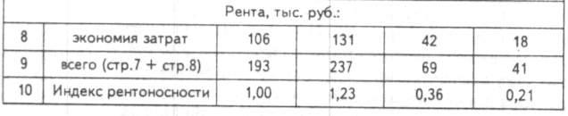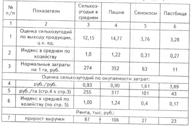 Размер ренты по видам сельхозугодий определяют на основе индексов рентообразующих факторов. Затем средние (в целом по сельхозугодьям) размеры рентного дохода дифференцируют по видам сельхозугодий: прирост выручки — по индексу оценки земли, рассчитанному по нормальному выходу кормовых единиц (оценка вида сельхозугодий по отношению к их общей средней оценке); экономия затрат — по соответствующему индексу окупаемости затрат в расчете на гектар (табл. 7).