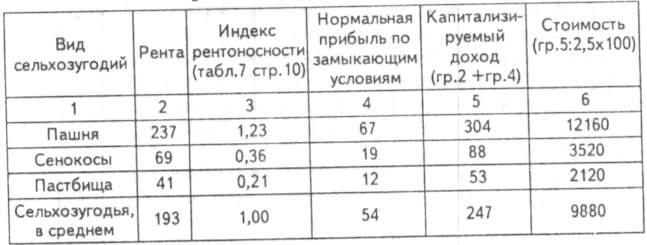 Оценку стоимости сельскохозяйственных земель осуществляют на основе данных о нормальной прибыли по замыкающим условиям (скорректированной на индекс рентоносности соответствующего вида угодий), ренты и нормы капитализации.