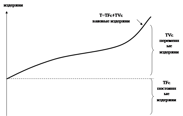 Сумма постоянных и переменных издержек составляет общие издержки) (Тс). Эти величины рассматриваются по отношению ко всему объему производства фирмы (Q), являясь ее функциями. Типичные графики зависимости постоянных, переменных и суммарных издержек от объема производства показаны в приложении № 1. Заметим, что общие издержки в точности равны сумме по вертикали переменных и постоянных издержек.