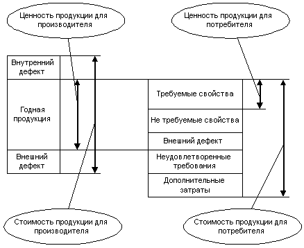 Для производителя вся продукция, не содержащая дефектов, которые препятствовали бы продаже этой продукции, имеет ценность. Для потребителя же ценность имеют только те свойства продукции, которые соответствуют его ожиданиям. Для нас важны три основные соотношения между ценностью и стоимостью: