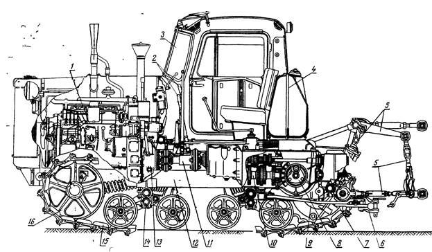 можна розділити на наступні основні групи: двигун, трансмісія (силова передача), ходова частина, механізми управління, робоче і допоміжне обладнання. Розташування основних механізмів гусеничного трактора (на