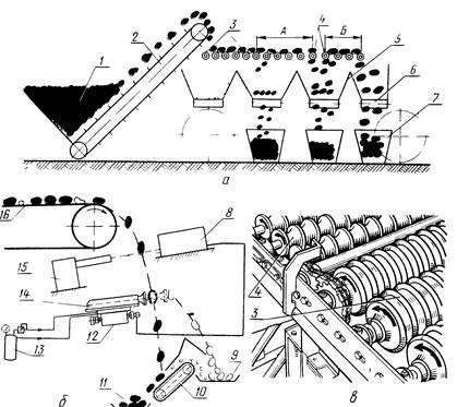Мал. 6. Роликова сортувалка(а, в) і