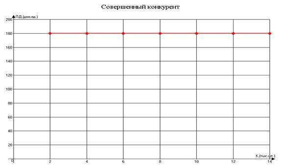 4. Итак, для графика совершенного конкурента Ц=const=90 (денежных единиц); ПД=const=180 (денежных единиц); ПД=DВВ; ПД не зависит от объёма производства (К).
