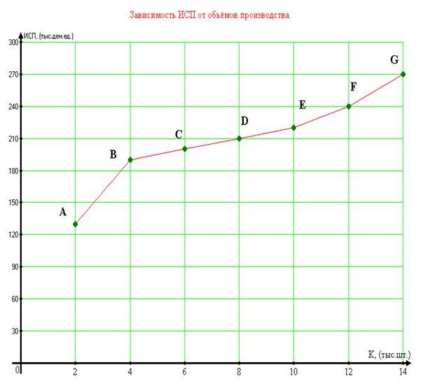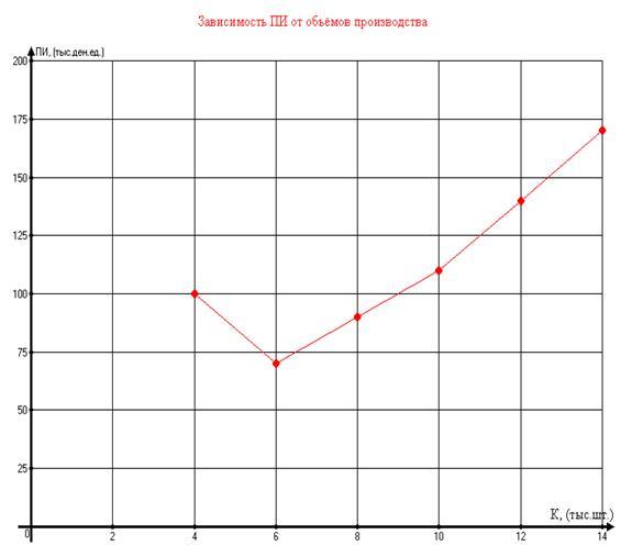 А – (·) пересечения графиков (ПИ\ПД от К) соответствует оптимальному объёму производства, т.к. при дальнейшем увеличении ПИ (начиная с К=6000 шт.), ПД начинает снижаться, а вместе с ним уменьшается и прибыль.