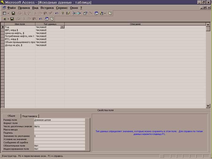 . Данные взяты из статистических справочников. Для занесения данных в Microsoft Access необходимо создать новую базу данных, затем таблицу в ней и последовательно ввести все имеющиеся данные по Японии в режиме конструктора (рис.1), заполняя строки с именами полей и типом соответствующих данных. Имена полей в данном случае – название экономических показателей за 32-летний период, а так как все данные числовые, то это будет отражено в соответствующих строках с типом данных. По завершении формирования макета исходной таблицы, необходимо открыть получившуюся таблицу и ввести все имеющиеся данные за каждый год в соответствующие графы таблицы (рис.2).