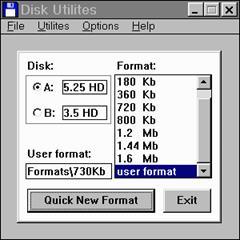 Требуется задать имя диска (A: или B:), тип формата (180 Kb, 360 Kb, 720 Kb, 800 Kb, 1.2 Mb, 1.44 Mb, 1.6 Mb). Также формат можно задать как “auto detect” (автоматическое определение типа формата) или “user format”. При “user format” надо задать имя файла, содержащего загрузочную запись (512 байт). Поэтому нет ограничения на количество форматов, и стандартно поддерживаются только семь - самых основных. Пользователь может сам создать загрузочную запись, содержащую требующийся ему формат, с помощью утилиты “Save User Boot Record”, описание которой вы найдете чуть дальше.
