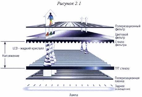 Экран LCD монитора представляет собой массив маленьких сегментов (называемых пикселями), которыми можно манипулировать для отображения информации. LCD монитор имеет несколько слоев, где ключевую роль играют две панели, сделанные из свободного от натрия и очень чистого стеклянного материала, называемого субстрат или подложка, которые собственно и содержат тонкий слой жидких кристаллов между собой [см. рис. 2.1]. На панелях имеются бороздки, которые направляют кристаллы, сообщая им специальную ориентацию. Бороздки расположены таким образом, что они параллельны на каждой панели, но перпендикулярны между двумя панелями. Продольные бороздки получаются в результате размещения на стеклянной поверхности тонких пленок из прозрачного пластика, который затем специальным образом обрабатывается. Соприкасаясь с бороздками, молекулы в жидких кристаллах ориентируются одинаково во всех ячейках. Молекулы одной из разновидностей жидких кристаллов (нематиков) при отсутствии напряжения поворачивают вектор электрического (и магнитного) поля в световой волне на некоторый угол в плоскости, перпендикулярной оси распространения пучка. Нанесение бороздок на поверхность стекла позволяет обеспечить одинаковый угол поворота плоскости поляризации для всех ячеек. Две панели расположены очень близко друг к другу. Жидкокристаллическая панель освещается источником света (в зависимости от того, где он расположен, жидкокристаллические панели работают на отражение или на прохождение света).