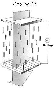 При появлении электрического поля, молекулы жидких кристаллов частично выстраиваются вертикально вдоль поля, угол поворота плоскости поляризации света становится отличным от 90 градусов и свет беспрепятственно проходит через жидкие кристаллы [см. рис. 2.3].