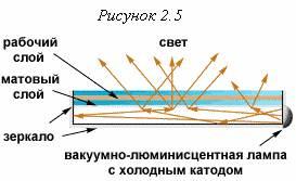 Часто STN ячейки используются в паре. Такая конструкция называется DSTN (Double Super Twisted Nematic), в которой одна двухслойная DSTN-ячейка состоит из 2 STN-ячеек, молекулы которых при работе поворачиваются в противоположные стороны. Свет, проходя через такую конструкцию в "запертом" состоянии, теряет большую часть своей энергии. Контрастность и разрешающая способность DSTN достаточно высокая, поэтому появилась возможность изготовить цветной дисплей, в котором на каждый пиксель приходится три ЖК-ячейки и три оптических фильтра основных цветов. Цветные дисплеи не способны работать от отраженного света, поэтому лампа задней подсветки -- их обязательный атрибут. Для сокращения габаритов лампа находится с боку, а напротив нее зеркало [см. рис. 2.5], поэтому большинство LCD-матриц в центре имеют яркость выше, чем по краям (это не относится к настольным ЖК мониторам).