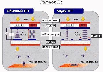 Совсем недавно специалистами компании Hitachi была создана новая технология многослойных ЖК-панелей Super TFT, которая значительно увеличила угол уверенного обзора ЖК панели. Технология Super TFT использует простые металлические электроды, установленные на нижней стеклянной пластине и заставляет молекулы вращаться, постоянно находясь в плоскости, параллельной плоскости экрана [см. рис. 2.8]. Так как кристаллы обычной ЖК-панели поворачиваются к поверхности экрана оконечностями, то такие ЖКД более зависимы от угла зрения, чем ЖК-панели Hitachi с технологией Super TFT, В результате изображение на дисплее остается ярким и четким даже при больших углах обзора, достигая качества, сопоставимого с изображением на ЭЛТ-экране.