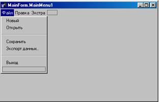 откроется окно конструктора меню (рис.1.1), в нём добавим названия меню : «Файл», «Правка», «Экстра». Для каждого меню пишем названия подменю. Для «Файл»:
