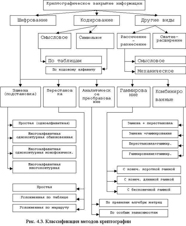 Для построения средств защиты от НСД необходимо иметь представление о методах криптографии. Их классификация приведена на рис. 4.3. Сам процесс криптографического закрытия данных может осуществляться как программно, так и аппаратно, однако аппаратная реализация обладает рядом преимуществ, главным из которых является высокая производительность. Сформулирована следующая система требований к алгоритму шифрования: · зашифрованный текст должен поддаваться чтению только при наличии ключа шифрования, · число операций для определения использованного ключа шифрования по фрагменту шифрованного текста и соответствующему ему открытого текста, должно быть не меньше общего числа возможных ключей, · знание алгоритма шифрования не должно влиять на надежность защиты, · незначительные изменения ключа шифрования должны приводить к существенному изменению вида зашифрованного текста, · незначительные изменения шифруемого текста должны приводить к существенному изменению вида зашифрованного текста даже при использовании одного и того же ключа, · длина шифрованного текста должна быть равна длине исходного текста, · любой ключ из множества возможных должен обеспечивать надежную защиту информации, · алгоритм должен допускать как программную, так и аппаратную реализацию. /6/ Современные широко применяемые методы шифрования можно разделить на два наиболее общих типа: с секретным ключом и с открытым ключом. Шифрование с секретным ключом симметрично – ключ, с помощью которого текст шифруется, применяется и для его дешифровки. Шифрование с открытыми ключами осуществляется с помощью двух ключей, поэтому оно относится к асимметричным системам шифрования. Открытый ключ не является секретным; более того, его доступность для всех и каждого, например за счет публикации в каталоге или включения в незащищенное сообщение электронной почты, имеет принципиальное значение для функционирования всей системы. Другой ключ, личный, служит для шифрования текстов, дешифруемых с помощью открытого ключа. /8/