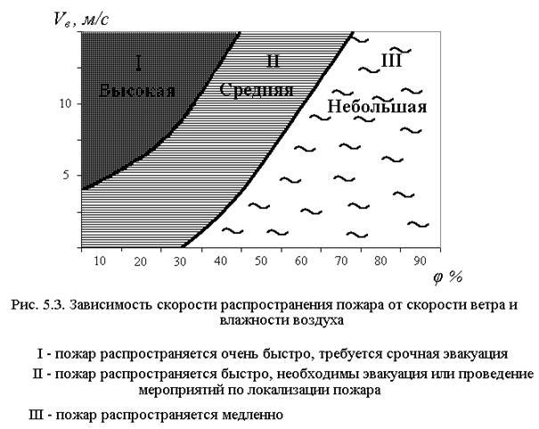 3. Определяем вероятность распространения пожара Р = f(П) 65 % (рис. 5.2.) 4. Определяем скорость распространения пожара в населенном пункте при средних условиях (рис. 5.3.). Скорость распространения небольшая (~ 120 м/ч) 5. Определяем проходимость улиц (таблица 5.5.). При Ст.0 III-V tразв. пож. = 1,2 часа, Rбез проезда = 20-50 м.