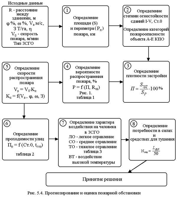 = где Nотд – число отделений пожаротушения, Lфр – длина фронта на одно отделение. Структурно-логическая схема прогнозирования и оценки обстановки при пожарах показана на рис. 5.4. 5.2.2. Комплексная задача по прогнозированию и оценке пожарной обстановки При сильном урагане возник мощный очаг пожара в населенном пункте, прилегающем к железнодорожной станции. Состав зданий: населенный пункт, станция (кирпично-деревянные). Расстояние между зданиями 10 – 15 м, Sзастр. = 30 км2 , Sрайона = 100 км2 . Метеоусловия Vв = 7-8 м/с, φ = 60 %. Защитные сооружения встроенные, негерметичные. Оценить пожарную обстановку. Решение 1. Определяем степень огнестойкости зданий (Ст.0) и категорию пожароопасности (КПО). Стапели, поселок, станция (деревянные) – V Ст.0, КПО «В» Кирпичные дома – III Ст.0, КПО «Г» При ∆ Pф = 30 кПа в поселке возможен пожар от разрушения коммуникаций 2. Определяем плотность застройки поселка