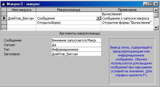 Существует еще один очень простой способ ввода макрокоманды. Допустим, нужно создать макрос, который должен открывать форму “Вычисление” в приложении “db