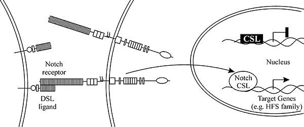 В локальных межклеточных взаимодействиях между незрелыми клетками Notch-путь контролирует ответ на специфические сигналы во время развития и определяет судьбу широкого спектра клеток в онтогенезе. На основании данных о генетических и молекулярных взаимодействиях ряд генов у Drosophila melanogaster с определенностью относят к кодирующим элементам Notch-сигнального пути: Delta (Dl, 3-66.2; 92А1-2), Serrate (Ser, 3-92.5; 97F1-F2), Notch (N, 1-3.0; 3C7), kuzbanian (kuz; 34C4-5) и Presenilin (PS; 77C1-7) – кодирующие, связанные с мембраной белки; Hairless (H, 3-69.5; 92E14-92E14), Supressor of Hairless (Su(H), 2-50.5; 35B10) и Enhancer of split (E(spl), 3-89.1; 96F11-14) – контролирующие ядерные белки (Lindsley, Zimm, 1992).