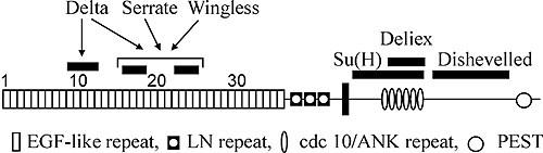 Отличительная черта белка рецептора Notch – наличие трех мотивов повторяющихся последовательностей аминокислот. Два из них обнаружены во внеклеточном домене рецептора (рис. 2). Вслед за сигнальным пептидом располагается тандемный ряд повторенной 36 раз консервативной последовательности, напоминающей эпидермальный ростовой фактор млекопитающих (EGFL-повторы). Сразу за ним идет второй тандемный ряд из трех других богатых цистеином последовательностей, названных lin12/Notch-повторами. Биохимическими методами показано, что EGFL-повторы всегда располагаются на поверхности клетки, как и в других связывающихся с мембраной белках, и служат сайтами связывания с молекулами лигандов (Warton et al., 1985).