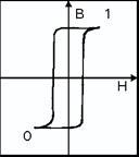 Энергонезависимая память позволяла хранить введенные в нее данные продолжительное время (до одного месяца) при отключении питания. Чаще всего в качестве энергонезависимой памяти использовались ферритовые сердечники. Они представляют собой тор, изготовленных из специальных материалов — ферритов. Ферриты характеризуются тем, что петля гистерезиса зависимости их намагниченности от внешнего магнитного пол носит практически прямоугольный характер. Рис. B.1. Диаграмма намагниченности ферритов.