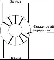 Вследствие этого намагниченность этого сердечника меняется скачками (положение двоичного 0 или 1, смотри рисунок B.1.) Поэтому, собрав схему, показанную на рисунке B.2, практически собран простейший элемент памяти емкостью в 1 бит. Память на ферритовых сердечниках работала медленно и неэффективно: ведь на перемагничивание сердечника требовалось время и затрачивалось много электрической энергии. Поэтому с улучшением надежности элементной базы ЭВМ энергонезависимая память стала вытеснятьс энергозависимой — более быстрой, экономной и дешевой. Тем не менее, ученые разных стран по-прежнему ведут работы по поиску быстрой энергозависимой памяти, которая могла бы работать в ЭВМ для критически важных приложений, прежде всего военных. Рис. B.2. Схема элемента памяти на ферритовых сердечниках.