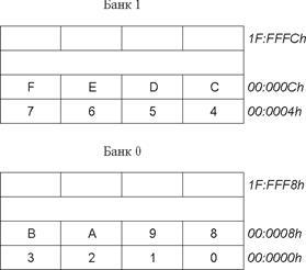 В системе с интерливингом —расслоением адресов ячеек памяти —весь объем памяти делится на два или несколько банков. Двойные слова с последовательными адресами располагаются в разных банках. Во время считывания информации из оперативной памяти за один цикл можно организовать параллельное извлечение информации из разных блоков, что уменьшает количество циклов ожидания.