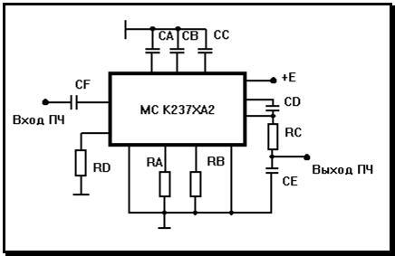 На частоте 465 кГц коэффициент усиления усилителя ПЧ составляет 1200 - 2500. Коэффициент нелинейных искажений не превышает 3%. Если входной сигнал меняется от 0,05 до 3 мВ, то изменение выходного напряжения не превышает 6дБ. Напряжение на выходе системы АРУ при отсутствии выходного сигнала составляет 3 - 4,5 В. Напряжение питания составляет 3,6 - 10 В. Потребляемая мощность не более 35 мВт.