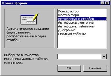 Появится диалоговое окно (рис.6), в котором следует выбрать Автоформа в столбец