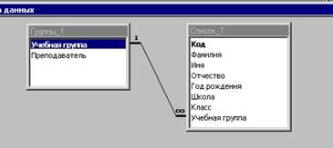 · В появившемся окне Добавление таблицы выделим таблицу Группы и щелкнем по кнопке Добавить. Выделим таблицу Список и щелкнем по кнопке Добавить. В окне Схема данных появится условный вид этих таблиц. Щелкнем по кнопке Закрыть окна Добавление таблицы.