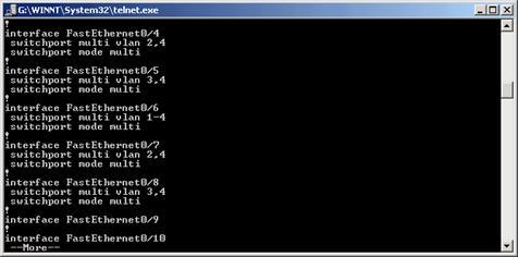 Во-первых, есть весьма существенные различия CLI у свитчей серий 2900 и 1900, а посему рассматривать их нужно отдельно. НачнЈм со свитчей серии 2900. Итак, вы подсоединили нуль-модемный кабель или запустили сеанс telnet. Во-первых на приглашение HOST_NAME> надо ответить enable и ввести пароль к свитчу, для получения доступа к конфигурации. Для просмотра сведений о свитче наберите show running-config. Подсказка по интерфейсу CLI. Здесь есть такие удобства как автозаполнение кнопкой TAB - наберите начало команды, например show ru<TAB>, и оно расширится в show running-config. Можно в любой момент получить справку по любому вопросу: просто нажмите ? и вам будут предложены возможные параметры команды, например show ?. Для повторения предыдущих или следующих команд можно использовать курсоры вверх или вниз. Для пролистывания текста при запросе --more-- нажимайте пробел для опускания текста вниз на строку. Итак, вы набрали show running-config и здесь отобразится информация. Вначале общая информация о свитче (адрес, имя, адреса шлюз и.т.д.), а затем информация о портах. Здесь особое внимание я бы хотел обратить на информацию о режиме VLAN порта: switchport mode %%%%. Access - режим статической VLAN; Multi - мультиVLAN порт; Trunk - режим trunk магистрали; Dynamic - VPMS режим. Следующий параметр switchport показывает особые параметры для данного типа порта. Например для access это единственный идентификатор VLAN, для multi - список допустимых VLAN, разделЈнных запятой или -, для указания промежутка VLAN.Таким образом, после сделанных изменений неплохо было бы смотреть, что именно произошло.