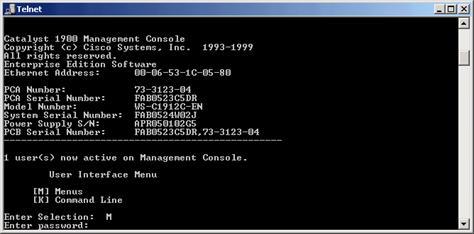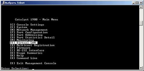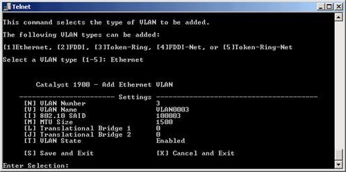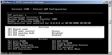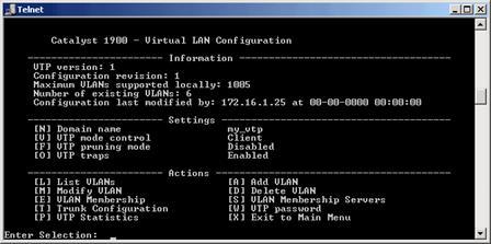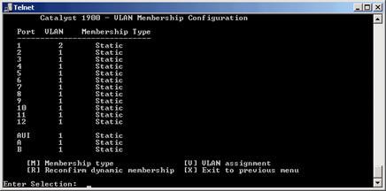 Для свитчей серии CISCO Catalyst 1900 нет поддержки мультиVLAN и вы должны назначать портам только типы static и trunk. Для управления коммутатором через CLI используется весьма удобная система меню: