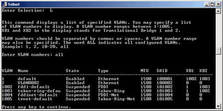 Для просмотра состояния VLAN нажмите L а затем на вопрос о диапазоне VLAN можно указать all для просмотра всех VLAN: