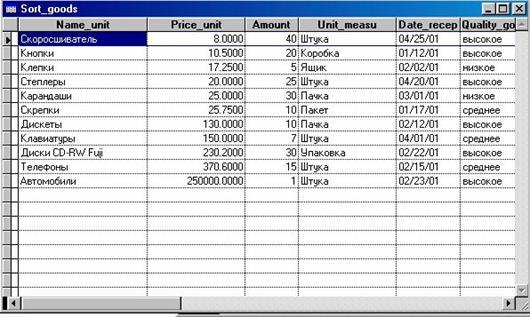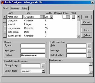На основании диаграммы и словаря данных составим структуру базы данных “Goods”. Поскольку на диаграмме изображено только одно объектное множество, то, следовательно, в базу данных будет входить только одна реляционная таблица. Перечислим и дадим названия полям таблицы “Table_Goods” в соответствии с диаграммой:
