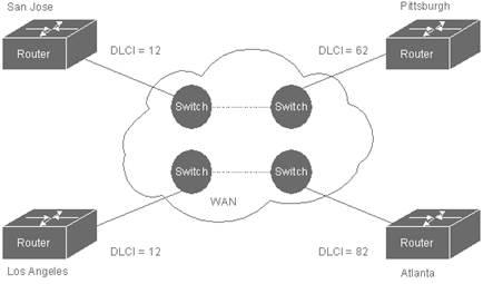 Рис. 2.2.2 предполагает наличие двух цепей PVC: одна между Aтлантой и Лос-Анджелесом, и вторая между Сан Хосе и Питтсбургом. Лос Анджелес может обращаться к своей PVC с Атлантой, используя DLCI=12, в то время как Атланта обращается к этой же самой PVC, используя DLCI=82. Аналогично, Сан Хосе может обращаться к своей PVC с Питтсбургом, используя DLCI=62. Сеть использует внутренние патентованные механизмы поддержания двух логически значимых идентификаторов PVC различными.