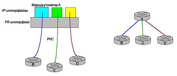 На рисунке 4.2.2, слева, изображена организация сетевого уровня на FR-интерфейсе с использованием подынтерфейсов типа point-to-point.
