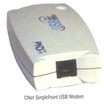 2.3.5 CNet SinglePoint 56K USB Modem. Модем 56К USB из линейки коммуникационных устройств CNet SinglePoint имеет только два разъема – USB и телефонный RJ-11. Питание осуществляется по шине USB. Модем совершенно универсален – его удобно использовать как с ноутбуком ( он на чуть не тяжелее модема формата PC Card), так и настольным компьютером, оборудованным USB-концентратором. Единственный двухцветный световой индикатор отражает состояние модема – от инициализации до отправки/приема сообщений. Установка драйвера происходит без проблем. Плюс на прилагаемом CD-ROM поставляется PDF-руководство и внушительный набор программного обеспечения, включая программы Internet Explorer 5.0, Netscape Communicator 4.6, Eudora Light, Net2Phone,MediaRing Talk 99, Real Player G2 и многие другие. Опыт работы с модемом показал, что даже на плохой линии он устанавливает достаточно скоростное (21,6 кбит/с) и устойчивое соединение. Производительность и устойчивость модема к помехам сопоставима с соответствующими характеристиками модемов USR Courier, снабженных русской «прошивкой». В модеме реализован стандарт V.90, возможна модернизация прошивки во флэш-ПЗУ. Модем поддерживает режим пониженного энергопотребления.(3)
