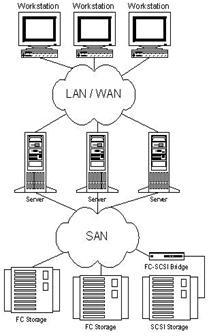 Сейчас же вновь появляется, если можно так выразиться, призрак прошлого. Во-первых, это всеобщее проникновение IT-технологий во все сферы экономики. Следовательно, возникает вопрос о максимальной эффективности капиталовложений. Но, несмотря на меньшие капитальные вложения, эксплуатация децентрализованной системы обходится значительно дороже и, если не предполагать, что система нужна на год-полтора, дешевле приобрести дорогой мэйнфрейм (естественно, что решаемые задачи должны быть адекватными). Предпосылками создания подобных систем является значительный прогресс в развитии средств передачи данных, например стандарт Fibre Channel, который и создавался специально для организации кластерных систем. Ниже на рис. 1 приведен пример схемы создания сети хранения данных на основе технологии SAN, базирующейся на FC, которая дает сторедж-системам преимущества технологий LAN/WAN и возможности по организации стандартных платформ для систем с высокой готовностью и высокой интенсивностью запросов.