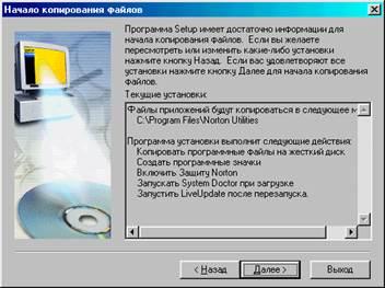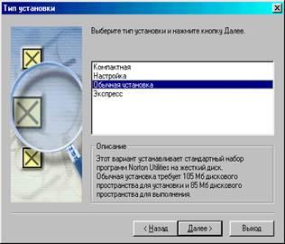 установку, этот вариант устанавливает стандартный набор программ Norton Utilities и требует 105 Мб для запуска и 85 Мб для выполнения. После чего следует нажать кнопку Далее.