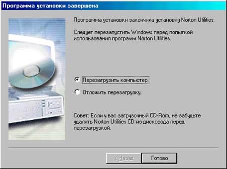 появление следующего окна свидетельствует о завершении установки программы. Для того чтобы использовать Norton Utilities прямо сейчас следует перезагрузить компьютер или сделать это позже, если пока не требуется работа с Norton Utilities. После чего нажать кнопку Готово