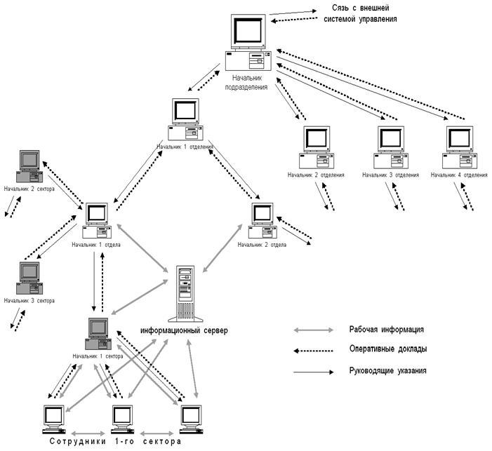 Наиболее подробно показаны информационные потоки в пределах одного сектора (для примера взят 1-ый сектор). В других секторах картина потоков информации аналогична.