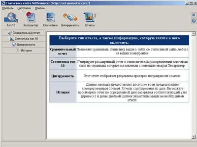 Мы уже вскользь упомянули о том, что, по мнению компании, профессиональная статистика не должна сводиться к получению отчетов о посещаемости вашего сайта. Поэтому в итоговый пакет программ были введены дополнительные возможности. Ряд модулей помогает отследить рейтинг вашего сайта в поисковых машинах, сравнить ваш сайт с сайтами ваших преуспевающих конкурентов, проанализировать индекс цитирования вашего сайта и оценить возможные партнерские отношения по обмену ссылками.