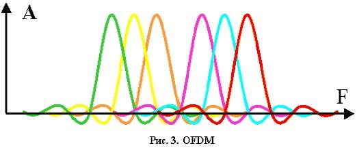 В случае же ортогонального частотно-разделенного мультиплексирования (OFDM), центры поднесущих частот размещены так, что пик каждого последующего сигнала совпадает с нулевым значением предыдущих (рис.3). Такое размещение позволяет более эффективно использовать доступную полосу частот.