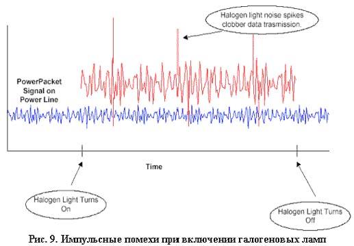 Данный метод делает технологию Powerline максимально гибкой при использовании в различных условиях. Например, в разных странах существуют различные регулирующие правила, согласно которых часть диапазона частот не может быть использована. При этом, в случае Powerline, в этом диапазоне просто не будут передаваться данные. Еще одним примером является случай, когда некое приложение уже использует часть диапазона. Аналогично первому случаю, в этом также выключается передача данных на определенных частотах, и два приложения могут спокойно сосуществовать в одной физической среде. Другой серьезной проблемой при передаче данных по бытовой электросети являются импульсные помехи (до 1 микросекунды), источниками которых могут быть галогеновые лампы (ри.9), включение и выключение различных электроприборов и т.д.