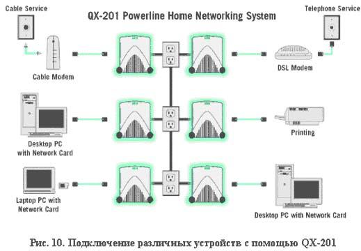 Расстояние между отдельными точками небольшое, несколько десятков метров. Как видно из рисунка, объединение пользователей в доме можно осуществлять через сеть электропитания, а в качестве доступа к магистральной сети использовать один или несколько модемов (кабельных или DSL).