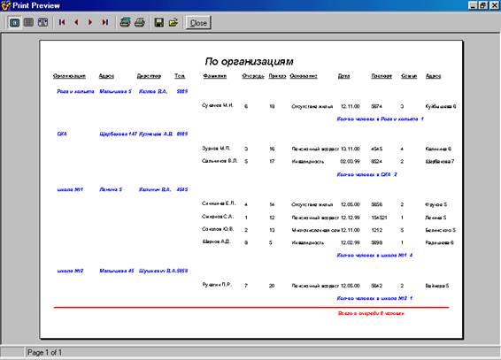 Теперь создадим отчёт. Для этого создадим новую форму. На ней разместим окно QuickRep. Найти этот инструмент можно в панели QReport. Два раза щёлкнем по свойству Bands, и поставим false в HasPageFoote и HasTitle. Далее в меню File выберем IncludeUnite, и выберем все Unit. Далее в свойстве DataSet укажем связь с соответствующим DataSouse. В поле Page Heater указывается то, что находится в шапке таблицы. Надпись можно создать при помощи инструмента QRLabel. В свойстве Caption этого инструмента вводим текст. Значения из таблицы могут быть отображены в отчёте следующим образом: Выбирается инструмент QRDBText. При помощи свойства DataSet связываем этот инструмент с таблицей. Далее указываем DataField, здесь выбираем нежную нам переменную, которая будет меняться. Свойство ParentFont делаем true. В шапке так же можно разместить номер листа или дату и время. Это делается при помощи инструмента QRSysData. В свойстве Data этого инструмента выбирается нужный формат. Далее под шапкой следует Column Header. Это тоже составная шапки. Далее идёт Group Header. В свойстве Expression указывается фильтрация таблицы, Свойство ForceNewPage указывается true что означает что фильтрация будет связана с появлением данных на новом листе. В поле Detail распологаются QRDBText, которые берутся из привязанной к отчёту таблицы или запроса. В поле Group Footer распологаются промежуточные результаты. Промежуточным результатом может быть сумма и т. д. Нахождение её возможно благодаря инструменту QRExpr. В свойстве Expression задаётся формула. В поле Summary располагается конечный результат, который высчитывается по формуле. И эту формулу можно получить при помощи свойства Expression (сначала необходимо поместить в это поле инструмент QRExpr). Предварительный запуск этого отчёта осуществляется следующим образом: Необходимо правой кнопкой мыши нажать в область QuickRep, затем выбрать Preview.