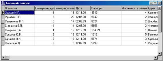 информации относятся: номер очереди, фамилия, организация, основание, номер приказа, дата, численность семьи, адрес , паспорт. Т. е файл: