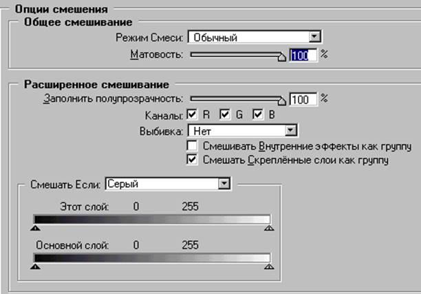 Элементы управления вкладки Опции смешивания окна Стили слоя.