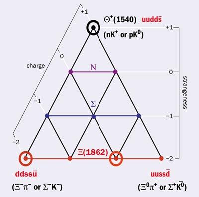 Предложенная в 1960-х годах кварковая модель оказалась весьма удачной для описания известных барионов как связанных состояний трех кварков. Однако, Квантовая хромодинамика не запрещает существование барионов, содержащих и более трех "кирпичиков". Поиски таких многокварковых состояний велись много лет, но до недавнего времени экспериментально не было обнаружено ни одного приемлемого кандидата. Новый импульс поискам придали теоретические работы Дмитрия Дьяконова, Виктора Петрова и Максима Полякова. Российские теоретики предсказали, что массы легчайших пентакварков (то есть состояний вида ), входящих в барионный антидекуплет (см. рис.1), сравнительно невелики и что ширина распада самого легкого из пентакварков должна быть чрезвычайно узкой [4]. Недавнее наблюдение такого состояния, получившего обозначение , открыло новую главу в барионной спектроскопии. Ожидается, что исследование прольет новый свет на поведение сильных взаимодействий в непертурбативной области (Н.Н.: то есть в области, в которой неприменима теория возмущений). является экзотическим барионом, поскольку он не может состоять из трех кварков. Это верно и для двух других членов барионного антидекуплета, обведенных на рис.1 красными кружками, которые имеют странность S = -2, заряды Q = -2 и 0 соответственно и входят в изотопический квартет -частиц (Н.Н.: напомню, что эта загадочная греческая буква читается КСИ).
